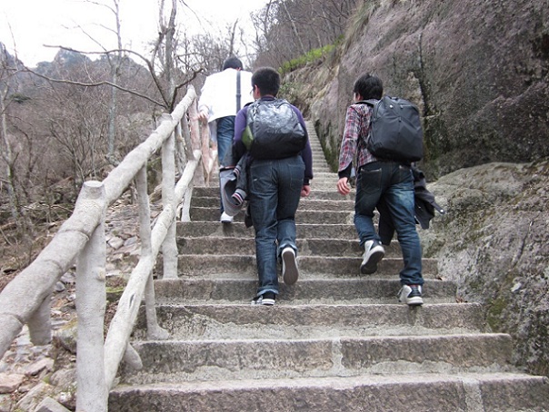 茶足饭饱之后,我们开始了登山之旅,我们是从后山的云谷寺开始登山的。一路上,刚开始还能连续走个半个小时,碰到一些奇景,就拍个照留个纪念。后来体力就渐渐吃不消了,登个一两百个阶梯就得停下来休息一下。看着挑山工还要挑那么重的物资,想想真不容易啊。虽然登山的这个过程很艰辛,但是对于整天学习的我们来说,这也是一个不错的锻炼机会。在登山的过程中,同学之间也互相帮助,大家相互勉励,艰难前行。