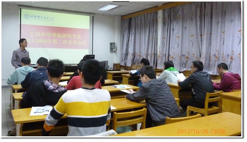 2012年10月26日19时,工程科学学院研究生会第二次全体会议在西区力二楼215教师顺利召开,我院研究生会全体干部参加了此次会议,会议由办公室主任李凯主持。