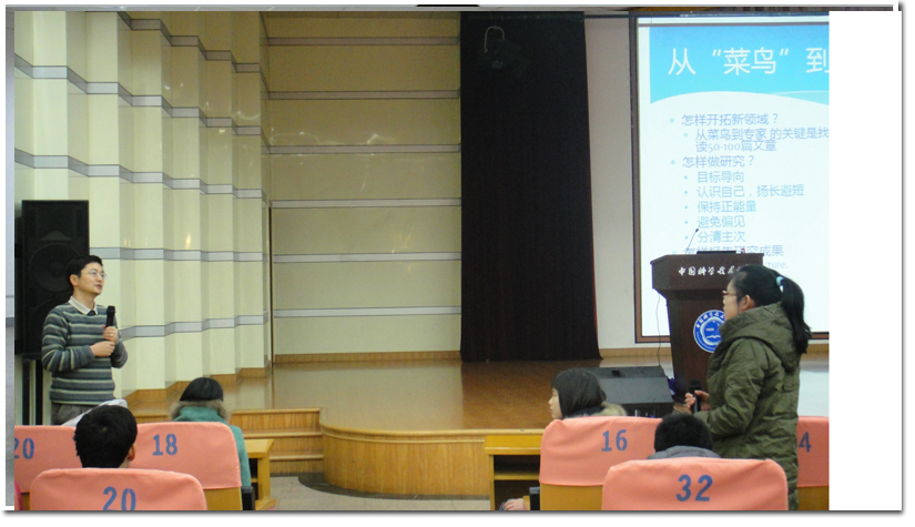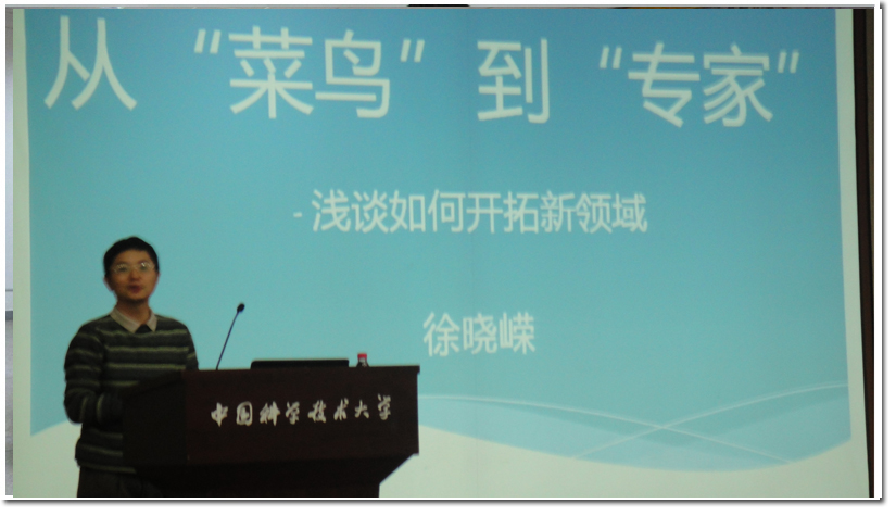 为了能使工程科学学院的学生们能早日以饱满的热情投入到科研中去,2012年12月18日工程科学学院研究生会有幸请到刚从美国回来的徐晓嵘教授在西区大礼堂为我们做主题为“从菜鸟到专家——谈谈如何开拓新领域”的专题报告会。