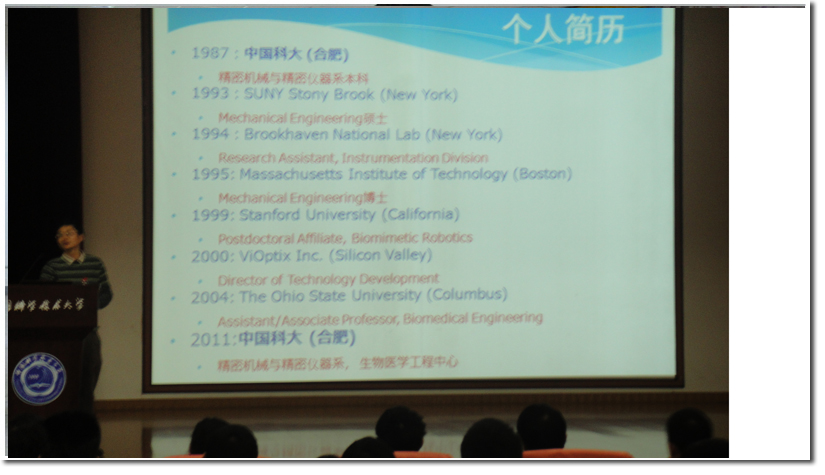 首先,徐教授向我们展示了他的个人履历表。徐教授本科就读于中科大精密机械与精密仪器系的,后来出国深造,现在在生物医学工程领域很有造诣,他此次回国的目的就是要填补我们国家在生物医学工程前沿领域的空白。
