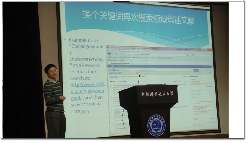 接着,徐教授向我们介绍了他这么多年来做科研的一些体会,并以胆囊切除手术这一简单的例子向我们说明他是如何在生物医学工程上速成的和怎样开展新的研究。具体就是先确定生物医学工程领域的专业词汇,并用这些专业词汇搜索几篇综述文章,跟踪这些综述文章,认真查看其中的参考文献,最后巧妙使用文献管理工具,试图自己写综述。慢慢地就会成为该领域的专家,这些对做科研的人来说是非常重要的。