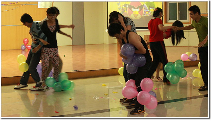 沈阳自动化研究所的三个壮小伙们豪情万丈地表演了中国龙与双节棍的表演。女主持人雷罗岚与成都光电所的其他同学们表演的动感舞蹈Sexy love吸引了台下观众不少眼球。南京天光所的李鹏志同学自弹自唱一首姑娘,将我们带回到那个纯真爱情的时代。成都光电所的公茂林同学一曲《天高地厚》用冲破云霄的高音将现场引向了沸点。为了增加观众们的参与度,晚会还穿插了踩气球和抢凳子两个观众们互动参与的游戏活动。照片中参与的观众们正兴致勃勃地玩着游戏,不时露出的窘态也惹得台下观众的阵阵欢笑声。
