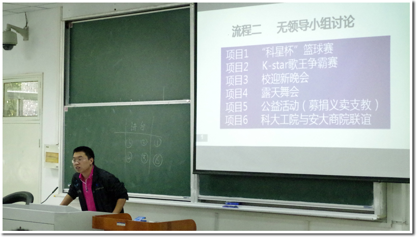 在第二个部分中,参加活动的同学们形成六个小组,就“科星杯”篮球赛、K-star歌王争霸赛、校迎新晚会、露天晚会、公益活动和科大工院与安大商院联谊等六个活动进行了限时45分钟的无领导讨论,并拟写活动策划书,以促进同学们对活动策划与活动流程的整体掌握,增加大家的团队协作能力。