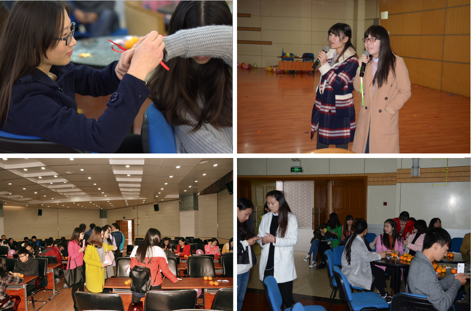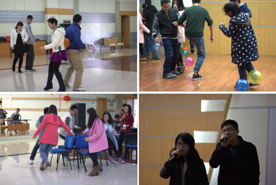 活动现场各种有趣的游戏一起开始。占据大厅最中心的背夹气球游戏吸引了好多对男女同学前来参与。舞台上的踩气球游戏相当热闹,也不时涌现出非常温馨的画面——男生耐心地为女同伴系气球。抢板凳游戏玩了一轮又一轮,大家还是沉醉其中。欢声笑语回荡在整个大厅。设置的点歌台也是热闹非凡,大家都踊跃的想要唱出自己的心声与开心。