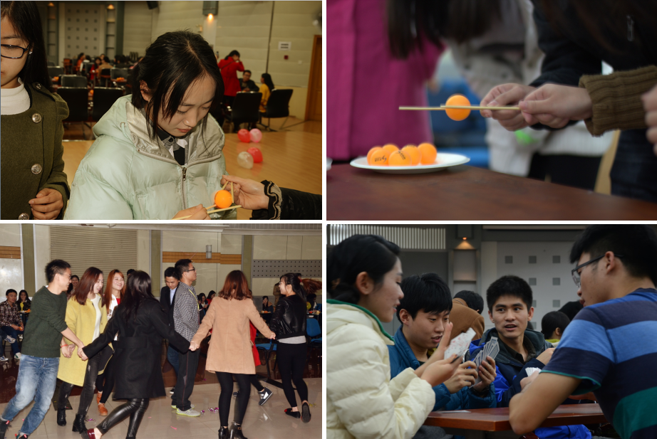 夹乒乓球游戏是在限定时间内,小组内成员夹着乒乓球进行传递。这个游戏考验的就是组内成员的相互协作性,有个共同的目标,大家会更好的合作,这很好的拉近组内成员间的距离。在台上的同学紧张并开心的玩着游戏的时候,下面的同学就在互相聊着天,很多组的成员还开始玩起了桌游。