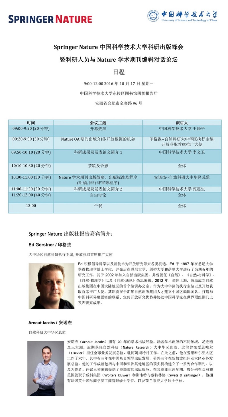 为了促进我校科研成果发表、国际学术交流、开放获取及开放数据等方面的工作,图书馆与Springer Nature出版社合作,将举办Springer Nature必威betway西汉姆网页版 科研出版峰会暨科研人员与Nature学术期刊编辑对话论坛。 峰会时间:10月17日(周一)9:00-12:00; 峰会地点:东区图书馆4楼报告厅; 报告嘉宾:Nature大中华区总监Arnout Jacobs,Nature大中华区执行主编兼开放获取首席推广大使Ed Gerstner;必威betway西汉姆网页版 李文卫教授、苑震生教授; 报告内容:Nature OA 期刊出版介绍-开放数据的机会;Nature 学术期刊出版战略、出版标准及程序 (组稿, 同行评审等程序); 科研成果及发表论文经验交流与分享。 欢迎校内感兴趣的老师参加。 特此通知。 图书馆 2016年10月14日