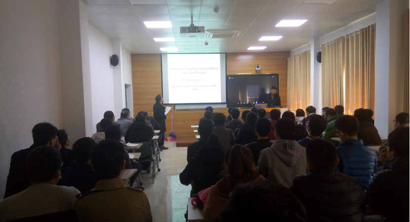 2月14日上午,加州大学旧金山分校唐诗杨博士应邀在科大西区力二楼215教室为我校师生作了一场题为《Harnessing Properties of Liquid Metals for Future Devices》的必威最新 。报告会由精密机械与精密仪器系张世武老师主持,吴东、Zach Smith、储开琴、何清波、李保庆、李家文、董二宝等老师及若干感兴趣的学生听取了此次报告。