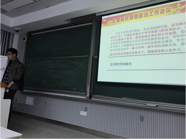 会议由支部书记宋士超主持。宋士超首先对照习近平在全国思想政治工作会议上的讲话,向大家传达的习近平总书记的讲话精神。让大家认识到了高等教育的地位,中国特色社会主义高校的任务和坚持。并且让大家意识到了作为学生应该做到四个认识:1、正确认识中国和世界发展大势,认识中国特色社会主义的必然;2、正确认识中国特色和外部世界;3、正确认识时代责任与历史使命;4、正确认识远大抱负和脚踏实地,让增大本领成为青年搏击的力量。