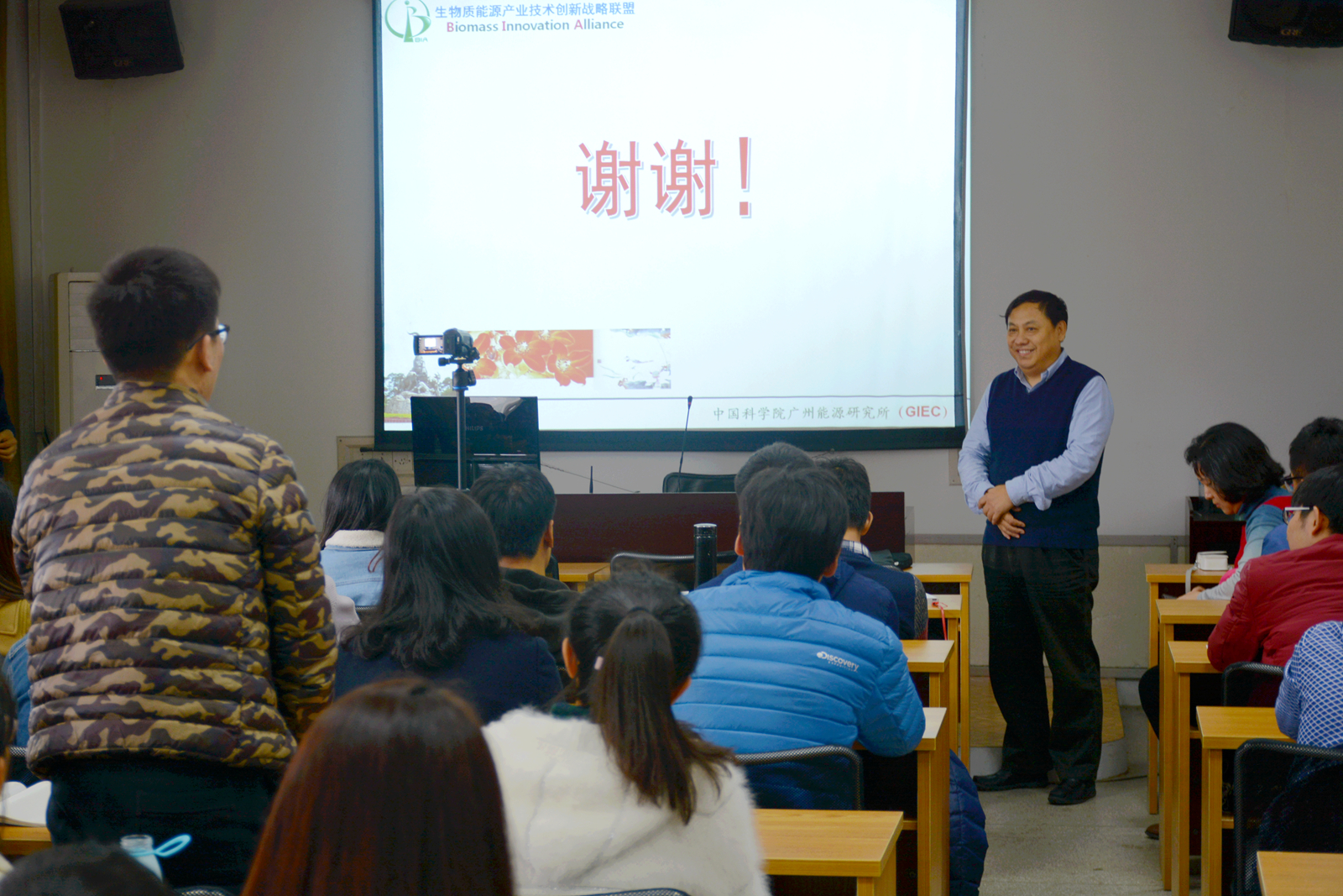 马隆龙所长全面介绍了生物质能源的背景及其应用技术。他指出,我国生物质资源量大面广,但目前其占总资源的消费比很低,提升空间很大。生物质能源由于其本身特性,较其他能源形式,在环境保护,缓解农业问题,建设生态文明等多方面的具有独特优势。目前在生物质能源利用方面,围绕生物质发电,生物质燃料,生物基材料和化学品等多种利用形式开发了一系列生物质能源技术。马隆龙所长在报告中详细介绍了多种生物质能源转化方式,并对每种转化方式的技术难题做了相应的说明。最后马隆龙所长结合国家的“十三五”的规划,通过介绍国家的生物质能源政策,进一步向师生们介绍了未来几年生物质发展的具体方向及发展目标。