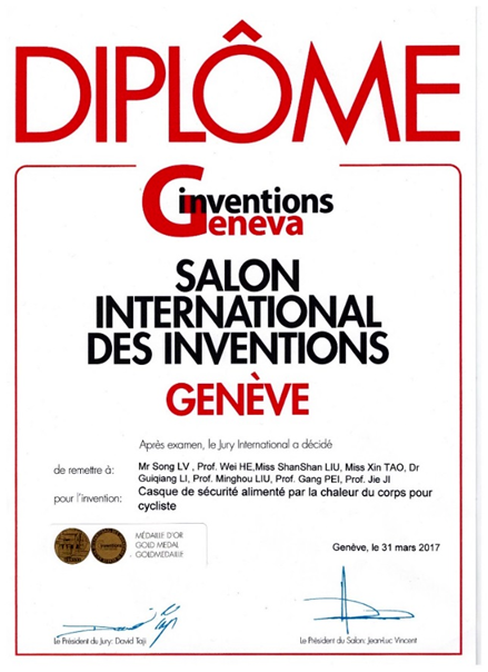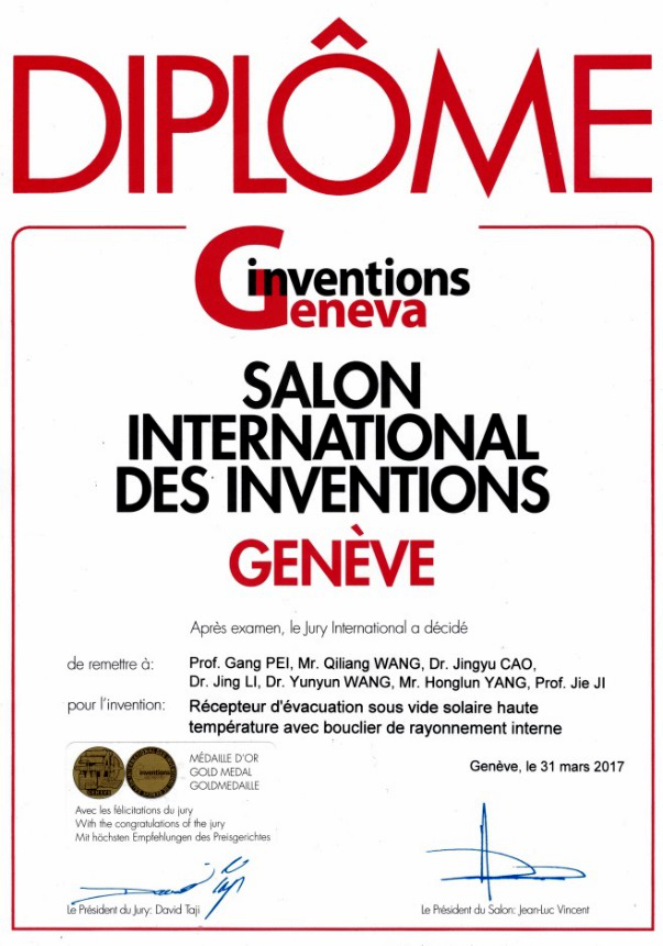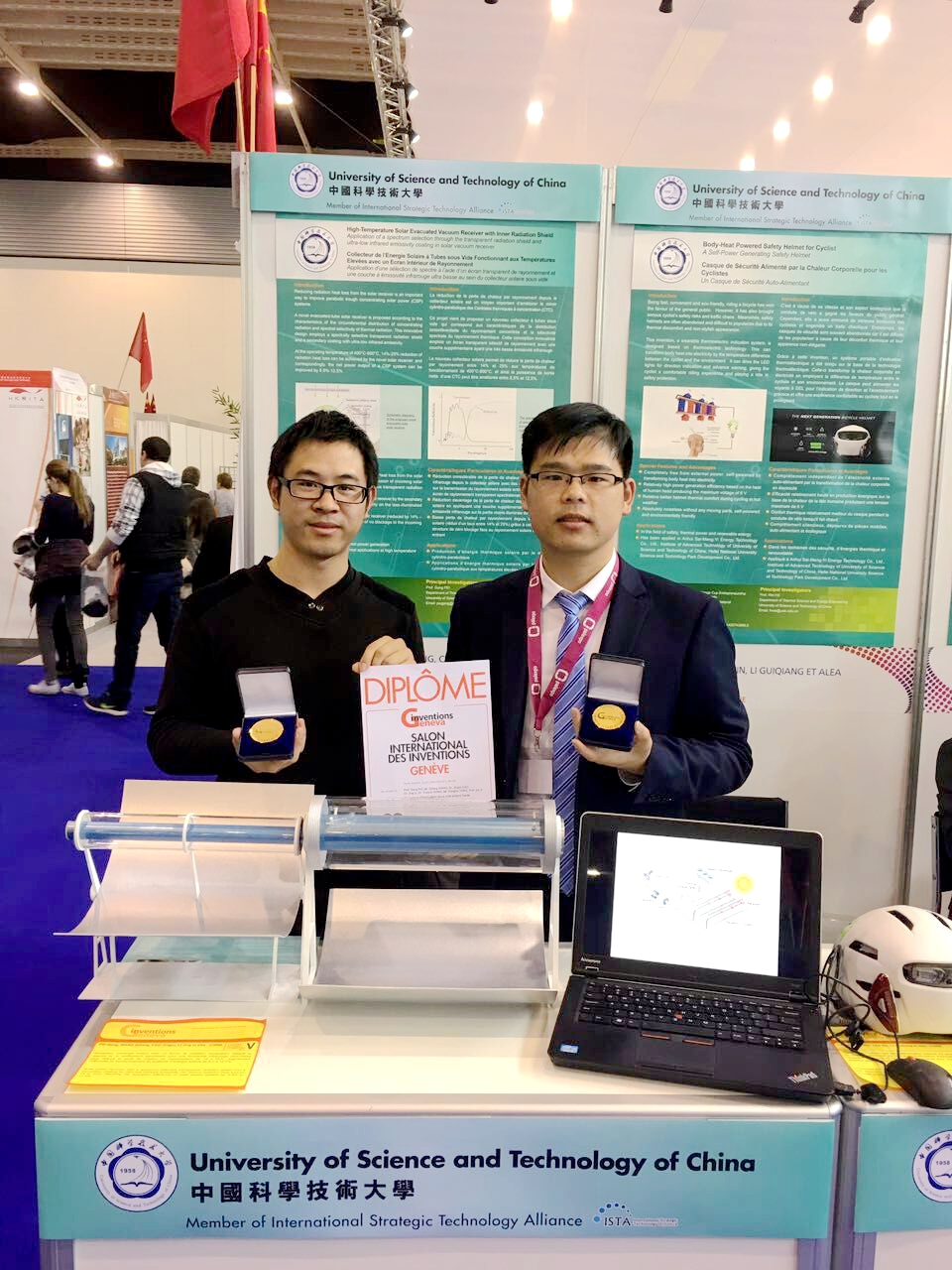 2017年3月29日至4月2日,第45届日内瓦国际发明展览会在瑞士圆满举行。工程科学学院热科学和能源工程系中科院太阳能光热中心裴刚教授课题组的“High-Temperature Solar Evacuated Vacuum Receiver with Inner Radiation Shield”项目、何伟教授课题组的“A Body-Heat Powered Wearable Safety Device”参加了此次国际发明展。两项发明分别获得了此次发明展的特别金奖和金奖。我系硕士生王其梁、博士生曹静宇代表裴刚教授课题组、硕士生吕松代表何伟教授课题组参加了本次发明展。这也是继去年裴刚教授课题组参加该发明展并获得特别金奖之后热科学和能源工程系连续第二年获此殊荣。