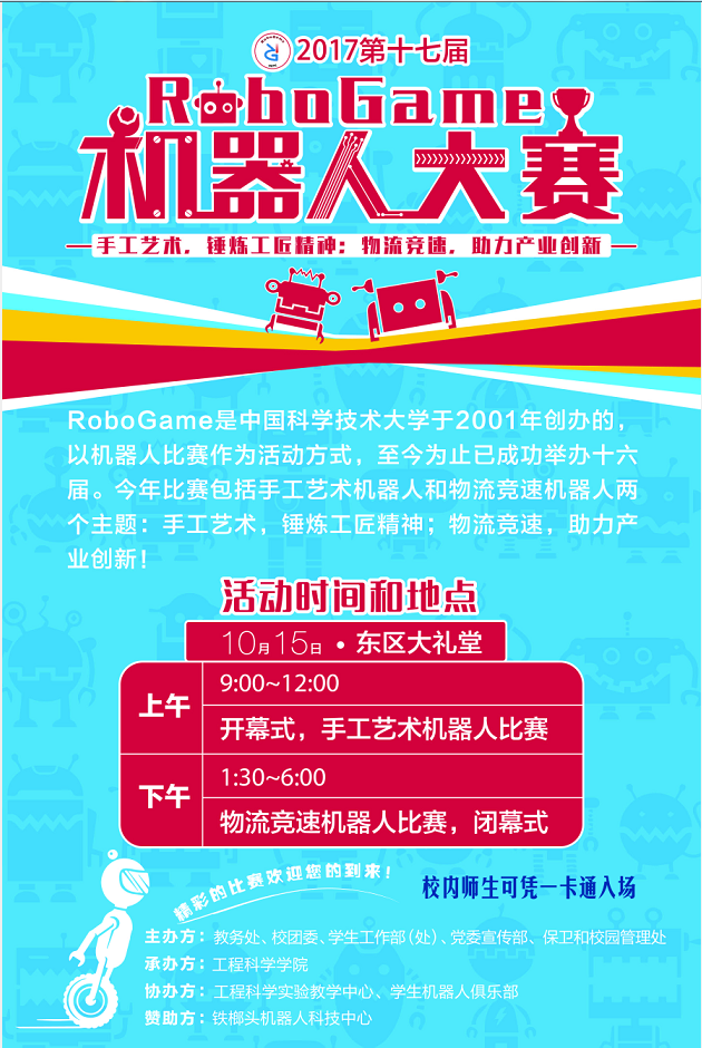 中国科大RoboGame机器人大赛自2001年创办以来,已经成功地举办了十六届,该活动在激发广大学生的学习、探索、创新意识,培养大学生实践动手能力和创新能力等方面取得了良好效果。