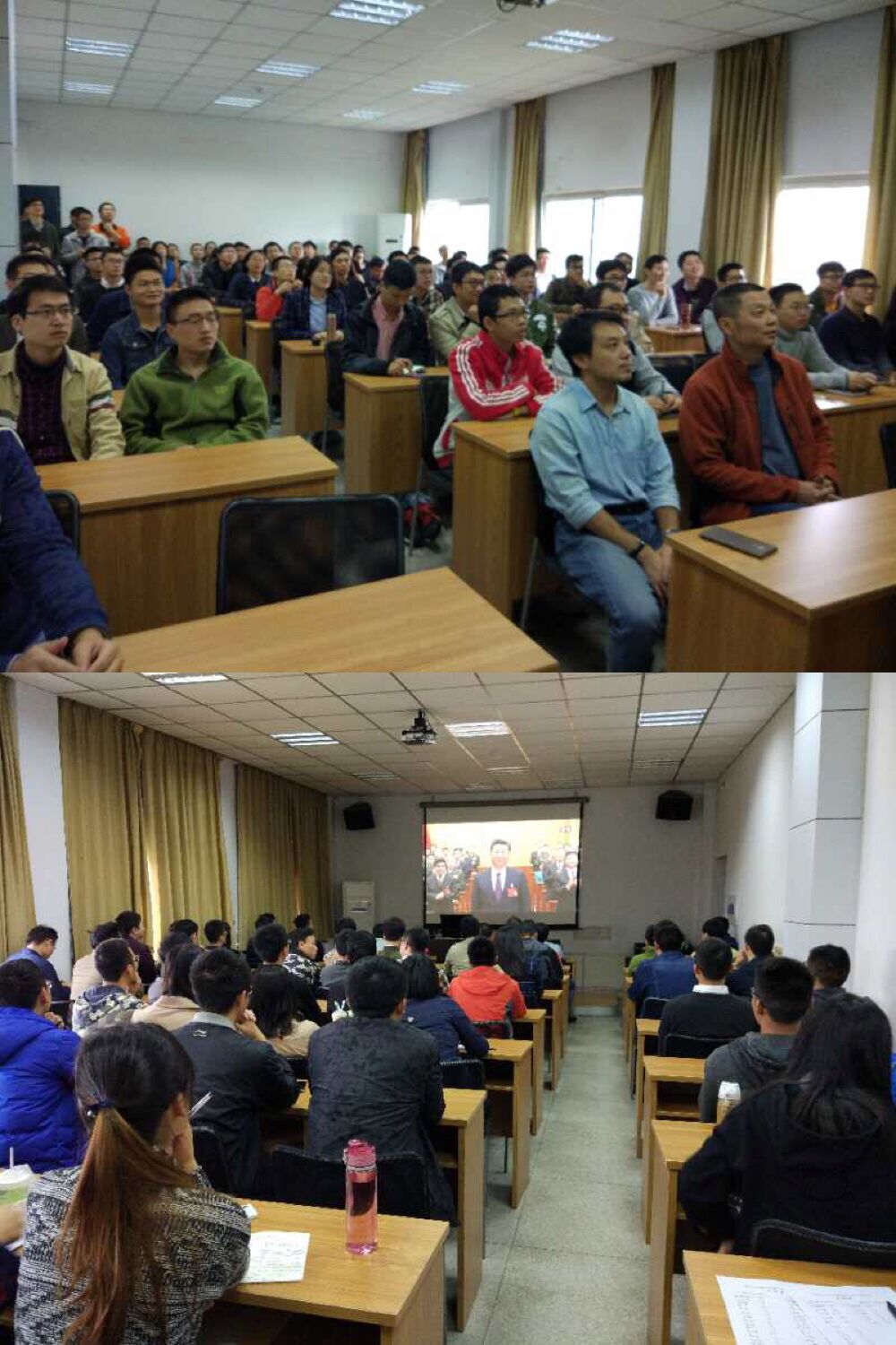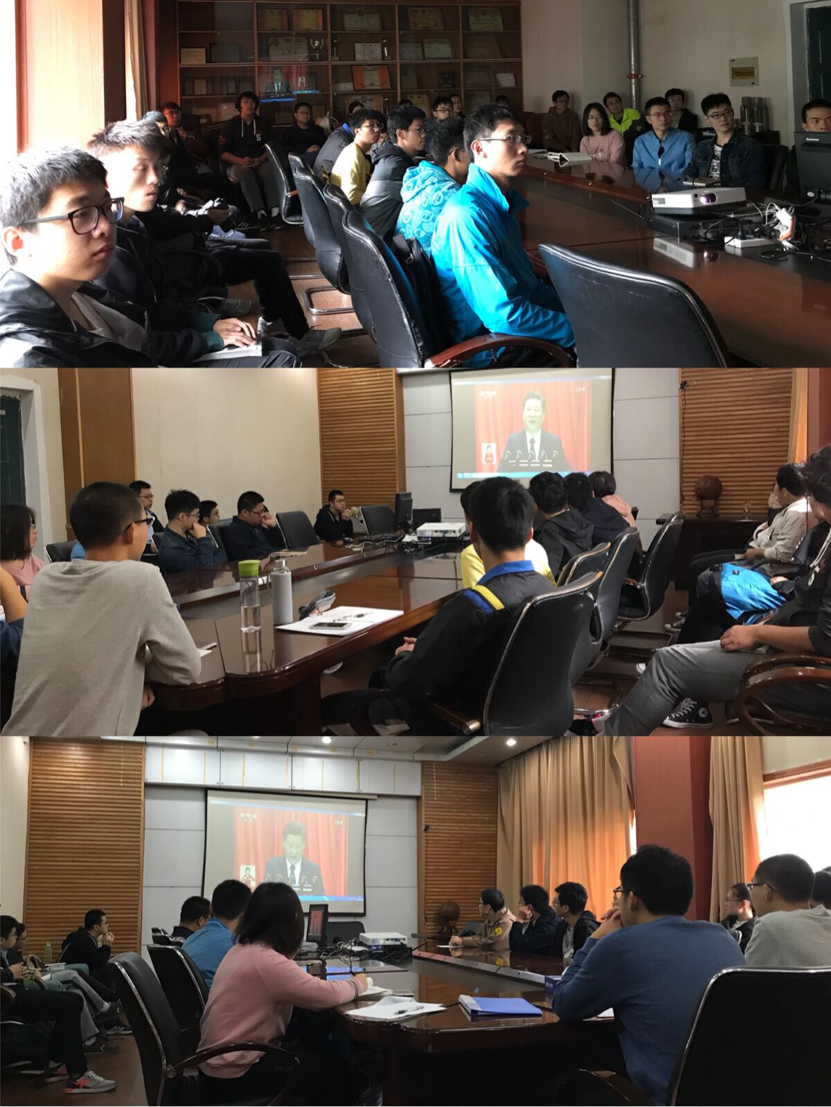 我院党委密切配合学校党委关于认真组织收听收看党的十九大实况转播的通知要求,提前安排场地,在院党委和院团委的带领下,分别在力一楼504教室和力二楼302会议室组织安排院党委委员、教工和学生党支部书记、党支部委员、民主党派同志、教师代表及学生骨干、学生代表等约140余人收看党的第十九次全国代表大会直播盛况。