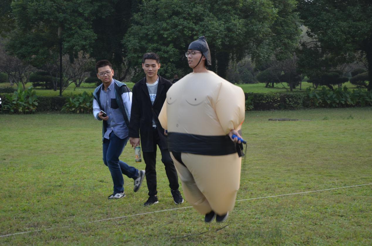一张大白的海报让人驻足,一个充气胖子在食堂门口引发围观。在一派欢乐(搞怪)的氛围中,“奔跑吧,胖子”活动于周日下午在西区北门边的草地上正式举行。当工作人员穿上(女装)充气服,围观的人越来越多。除了科大的同学们,不少经过的老师,小孩也都对这些假胖子(当然也有真的)颇为感兴趣。活动开始不久,草地一侧已经站满了人。