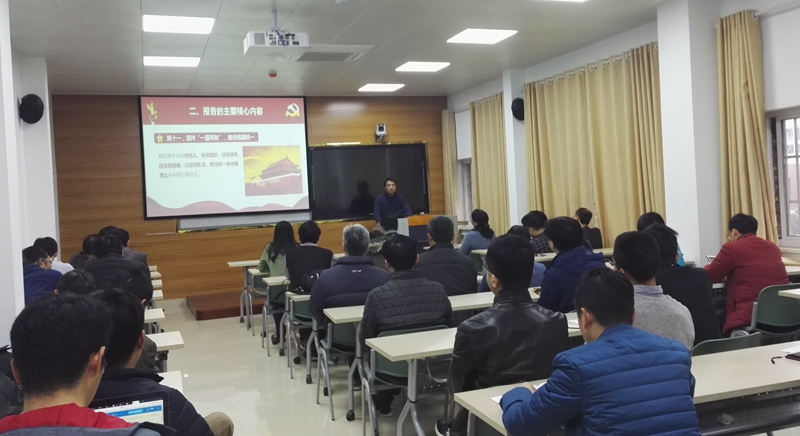 会议首先由总支书记赵钢做了题为《不忘初心 牢记使命 切实用党的十九大精神武装头脑》的专题辅导报告。赵钢从“十九大报告的重大意义”、“十九大报告的主要核心内容”、“贯彻落实好党的十九大精神要求”等三方面对全体教职工学习十九大精神做了讲解和阐释,以此为基础,结合各位教职工的本职工作,赵钢要求各党支部、教研组做好十九大精神的学习和领会,并号召各位教工在十九大精神的引领下,切实做好本职工作,增强主观能动性,将对十九大精神的理解体现在实际行动中。