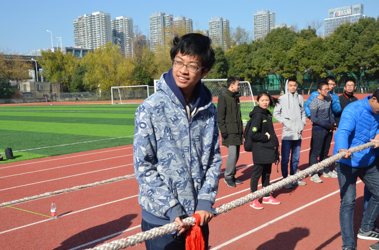 比赛正式开始。随着裁判神秘微笑着下了口令,双方的口号即刻炸成一片,其间还有鞋底狠狠摩擦红色跑道的撕扯的声音。16级9系、14级5系与14级9系的第一场比拼在双方队员都拼了命、尽全力贡献力量后迅速结束,或许是前者队员脸上的面具太搞笑,或许是绳结的范围线太窄,观众们本以为会僵持一阵子的比赛匆匆结束。恍惚之间第二场也在瞪大了眼磨肿了手咬紧了牙之后,裁判大喊好多遍“结束了,都别拉了”,大家才不舍地松手。赢了的输了的都很开心,低头看看,嗯,鞋底还在;张开手,噫,居然没磨烂,还能写作业。之后的几场比赛多如此,无论结果如何,都是咬紧牙关用这平时拿笔杆子的小嫩手为全班的荣誉使出了所有的力气。胜了当然很好,输了也虽败犹荣。