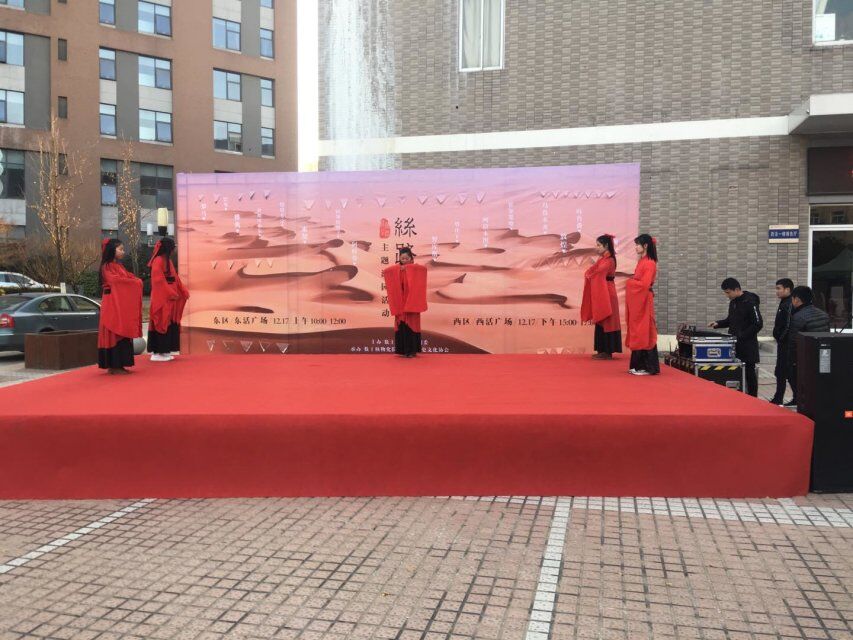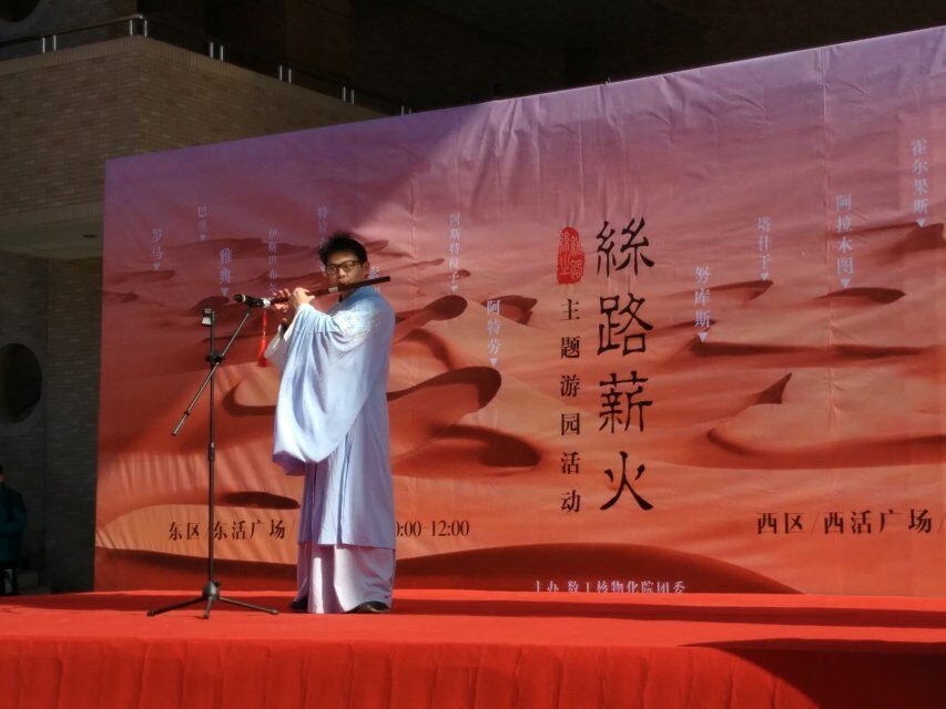 当天上午十时许,美食广场前就已经搭建起舞台,伴随着《礼仪之邦》的悠扬旋律,一场别开生面的汉文化和西域文化秀正式上演。其中竹笛独奏《乱红》用凄婉旋律为我们描绘了思念着丝路羁旅之人的闺中少妇面对“乱红飞过秋千去”时的柔肠百转,让人顿生“司马青衫”之感;相声社为我们带来的相声《博古通今》在诙谐幽默中让我们感受到了丝路文化的沉淀;灼华汉服社带来的汉舞《半壶纱》富有禅意,让我们不由得喟叹丝路行者的艰辛。