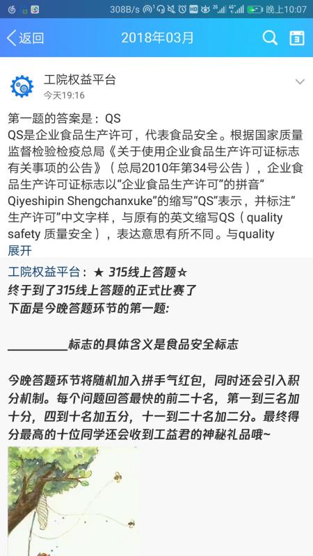 线上权益知识答题普及活动于3月15日晚20:00至21:30进行,本次答题活动采用独特的密码红包问答形式,通过工院学生会权益部的公众号工院权益平台,每隔15分钟发布一次带有知识普及性质的题目,并及时公布答案并附带上相关维权知识。活动后根据答题情况进行排名,并发放对应奖品。