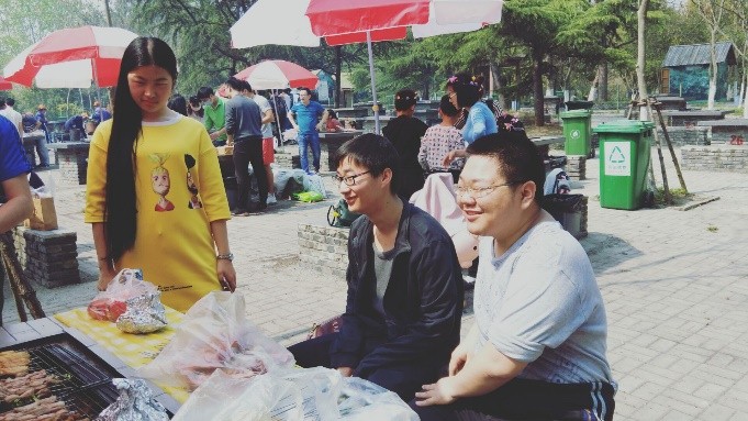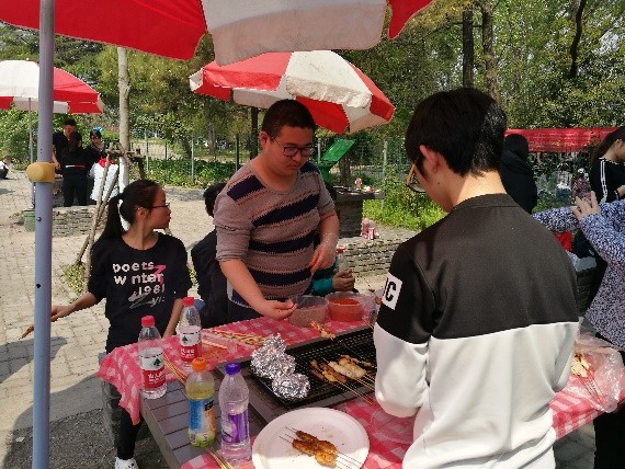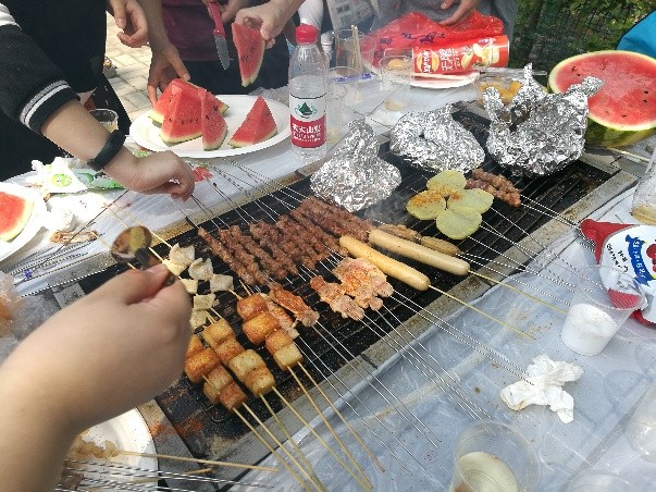 租了烧烤架和遮阳伞,工作人员向炉中添了炭火,我们拿出今晨一早从烧烤店里送来的食材。受到班长邀请一同前来的宿管林姐,带来了薯片、乌梅等零食,大家就着酸奶和汽水,开始一场盛宴。备好孜然,辣椒,盐,油等调料,几位精于烧烤的同学在烧烤架前气定神闲,举重若轻。三位“烤官”拿出许多食材迅速排列整齐,用刷子蘸油在肉串的两面一刷,不时翻面,将熟时匀匀地撒一层孜然少量辣椒粉。在炽热的炭火上,烤串很快就熟了。围观在旁的众多“老饕”早就忍不住肚中馋虫,迅速分食干净,未且尝出多少滋味,只觉肉质鲜嫩,味道肥美,再回神,早已吃个干净。在香气和笑声中,五花肉串,羊肉串,鱼豆腐,金针菇,土豆等诸多美食都逐渐从烤架上转移到我们的腹中。