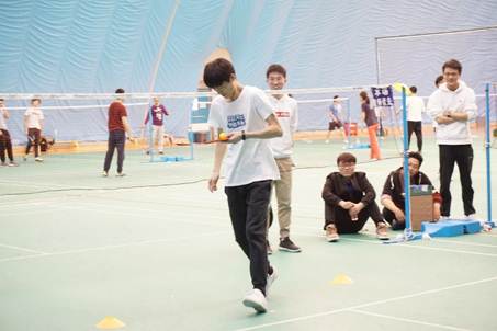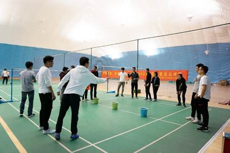乒乓球投壶比赛采用两人组队的方式,每组参赛者在一定距离以外,按先后顺序把乒乓球投向壶中并通过计“筹”来判定胜负。托球接力赛采用五人组队的赛制,将乒乓球放在球拍上,单手握把,从起点跑到终点,若中途掉落则从起点重新开始,接力者同上,计时最短的小组获胜。精彩有趣的赛制让同学们迅速投入到比赛中,羽毛球馆内充满了欢声笑语。