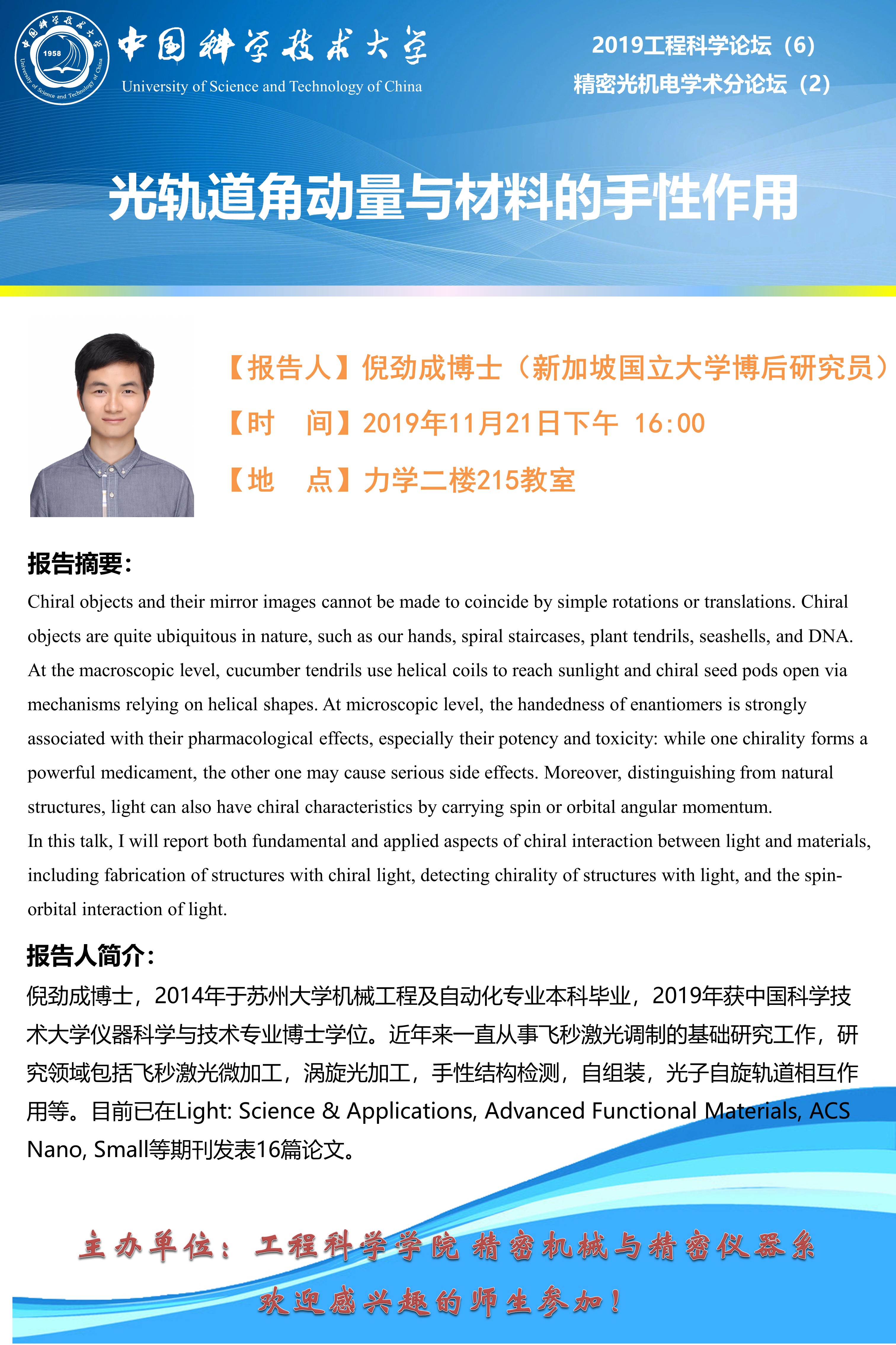 2019工程科学论坛(6)“光轨道角动量与材料的手性作用”报告会