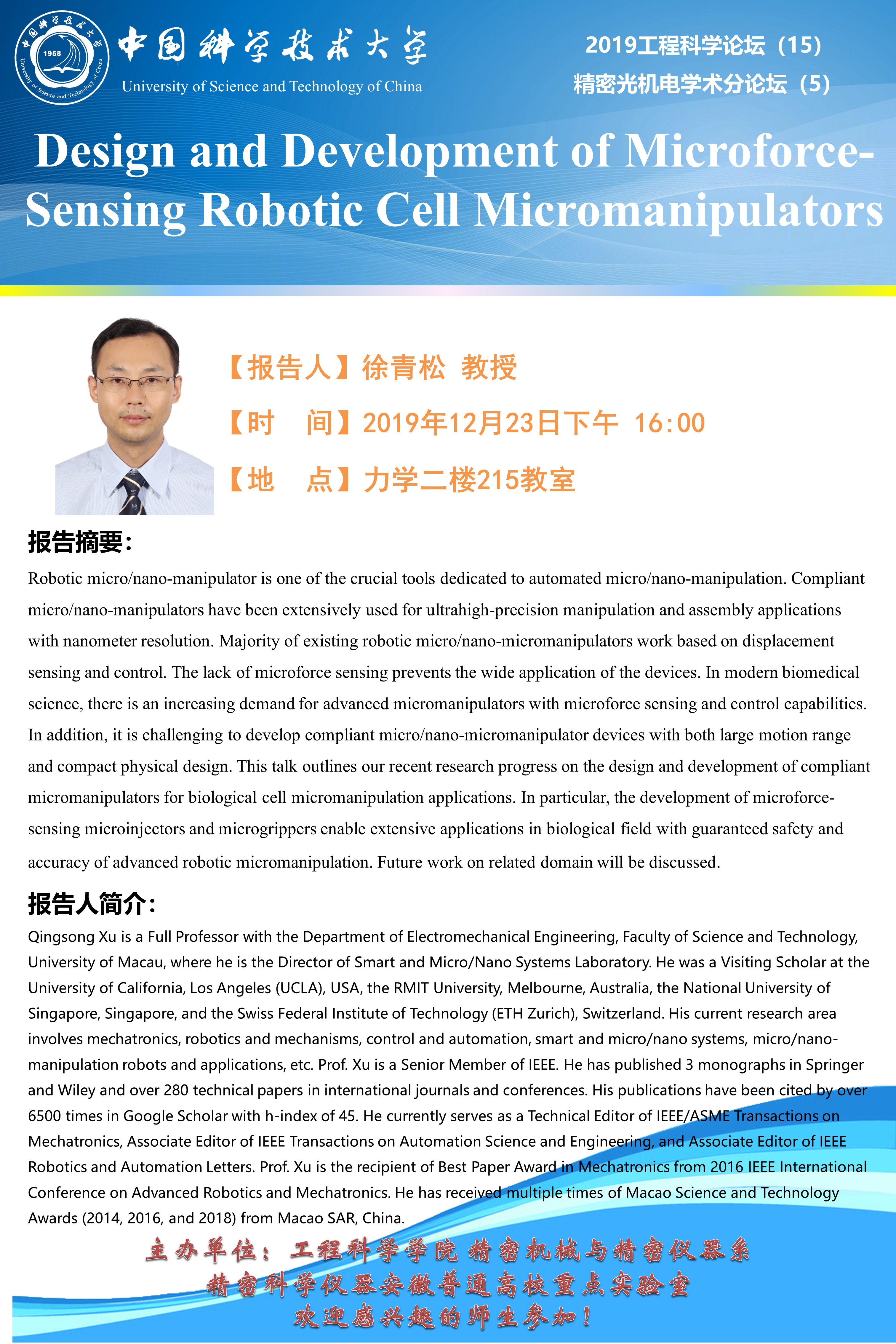 2019工程科学论坛(15) "Design and development of Microforce-Sensing Robotic Cell Micromanipulators"报告会