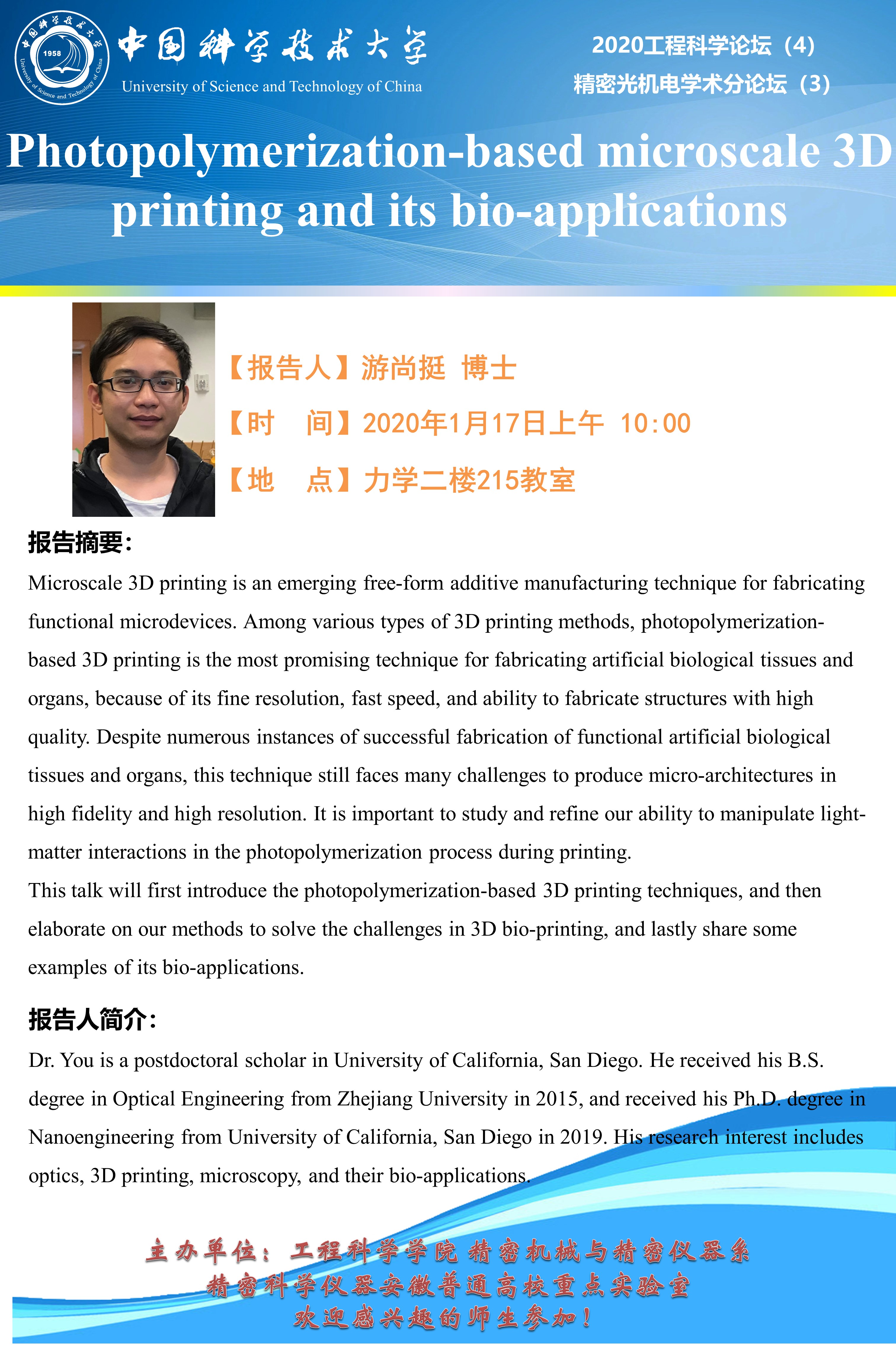 2020工程科学论坛(4) "Photopolymerization-based microscale 3D printing and its bio-applications"报告会