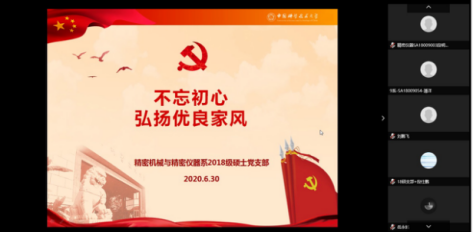 6月30日,精密机械与精密仪器系2018级硕士生党支部通过线上的形式召开全体党员大会,开展“不忘初心,弘扬优良家风”主题党日活动。此次会议由支部书记谭延东主持。
