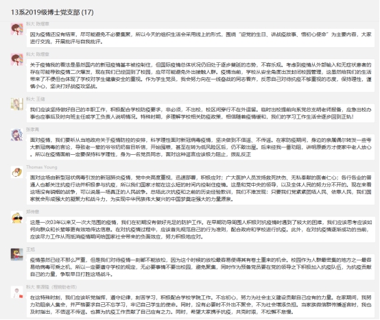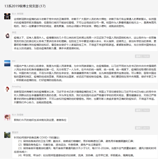 支部每位同志从身边事情出发,发表各自的学习心得,并且互相讨论,互相学习。虽然国内的新冠疫情基本被控制住,但国际疫情总体状况仍旧处于逐步蔓延的态势,不容乐观。考虑到疫情从外部输入和无症状患者的存在可能导致疫情二次爆发,支部成员一致认为虽然已经回到了校园,应尽可能避免外出接触人群。学校从安全角度出发封闭校园管理,这虽然带来了不便但也体现了学校对学生健康安全的重视。作为学生党员,要向在一线奋战的同志看齐,保持理性,谨慎小心,坚决打好战疫攻坚战。