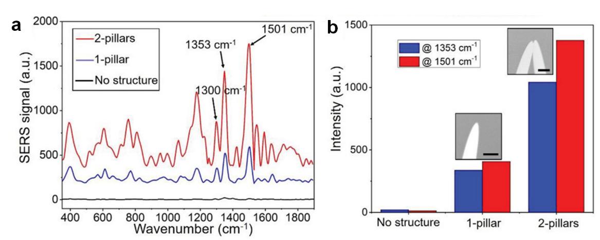 图2. (a)不同的结构的表面拉曼增强光谱;(b)结构类型对SERS光谱的影响关系。