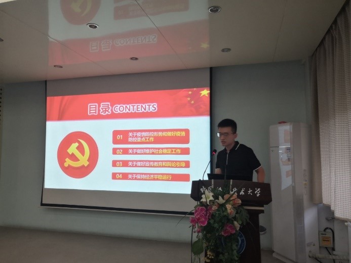 近代力学2018级博士党支部于2020年9月23日下午4点在力学一楼239会议室召开“学习习近平总书记在抗击新冠肺炎疫情表彰大会的重要讲话精神”主题党日活动,会议由支部第二党小组组长陈涵同志主持。会议开始,王文江同学首先做了题为“众志成城,抗击疫情——解读习近平关于应对新型冠状病毒的重要讲话”的学习报告,系统地介绍了习近平总书记在抗击疫情过程中的若干讲话精神和指导方针,展现了从疫情发展之初至今,党和国家以人民切身利益为重,由总书记亲自领导、亲自部署,全国上下团结一心共同抗疫的伟大斗争。