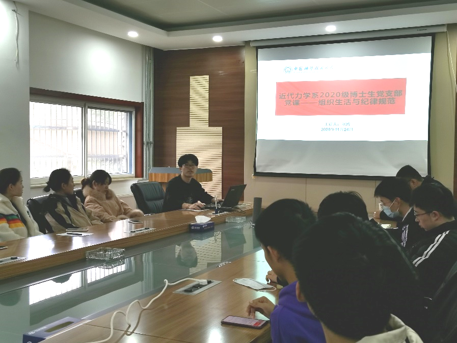 为深入学习党的十九届五中全会精神,促进党员同志在实际生活中严于律己,加强理论和时政的学习,近代力学系2020级博士生党支部于2020年11月24日在电二楼102会议室,开展了学习党的十九届五中全会精神主题党日活动。会议由梅开男主持,全体党员及入党积极分子参加本次活动,中科院材料力学行为和设计重点实验室教工支部书记王奉超老师应邀出席本次活动。