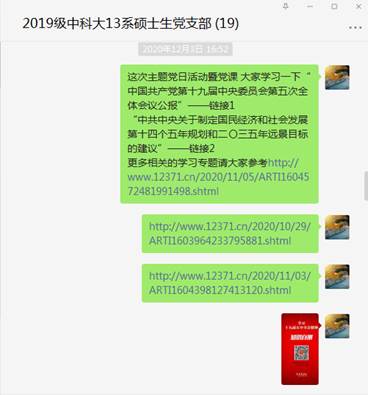 在事先了解了大家的空闲时间之后,支部书记将提前整理的学习材料发到支部群里,供大家集中学习。之后又附了一个十九届五中全会的自测链接,供大家学习之后检验一下自己的学生成果。