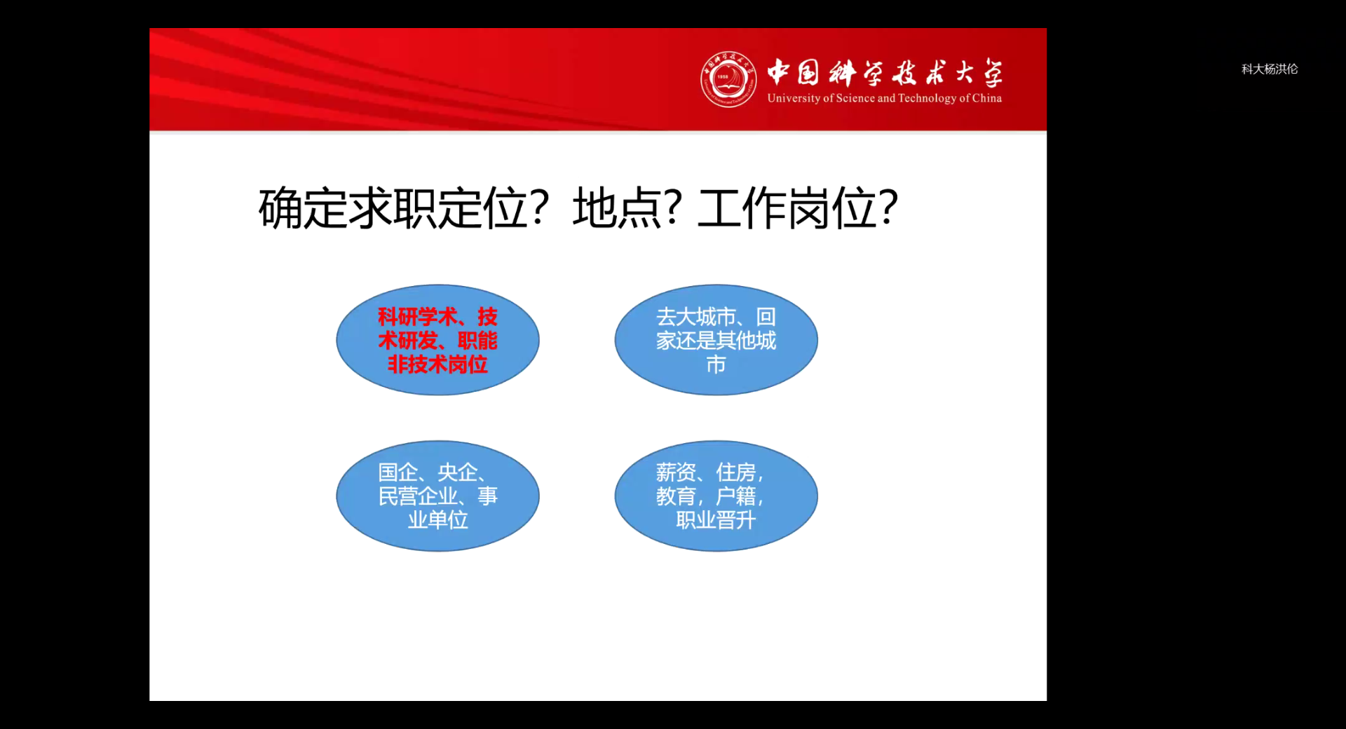 第二位分享嘉宾是杨洪伦师兄,他就如何确定一项工作是否适合自己分享了宝贵的经验。杨洪伦师兄告诉我们要从岗位职责、单位性质、所在城市以及未来发展四个角度来综合考虑所获得的offer是否适合自己。之后就薪资福利问题提出建议,一定要将薪资待遇落实到纸面上,确定好自己的福利待遇。最后,他就同学们提出的工程热物理专业就业问题进行了解答。
