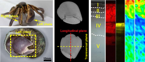 图4.寄居蟹左螯中的宏观结构和层状力学梯度优化了结构的抗冲击性能.