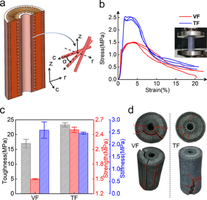 研究人员使用3D打印技术制备了多个尾刺的仿生微结构,通过力学测试验证了Bouligand结构与径向的平行层状结构的组合能极大地提高结构总体韧性和强度这一设计理念。这为制备高强高韧的仿生复合材料提出了一条新的路径。