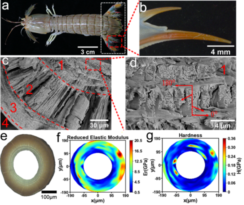 螳螂虾尾刺的外骨骼包括四个不同的结构层,每层都具有不同的微观结构和化学成分特征。这些层状结构的局部力学性能与微结构和化学成分密切相关,几者的组合有效地限制了裂纹的扩展,同时最大限度地释放了变形过程中的应变能,提高了结构的整体韧性和强度。