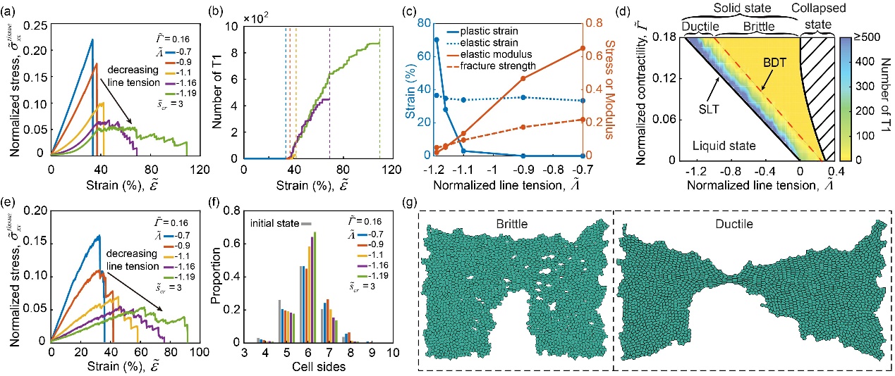 针对以上问题,姜洪源课题组通过引入一种新的拓扑转换(T4转变),发展了一种改进的细胞顶点模型,研究了上皮细胞单层的力学性质和断裂破坏机制。该研究团队发现了一种由单细胞力学性质及细胞间粘附性质决定的脆韧转变现象,揭示了外加荷载可以激活韧性细胞单层中的细胞重排布行为,其塑性变形来源于细胞单层内部与石墨烯等二维材料中常见的拓扑缺陷类似的“5-7缺陷”的形核和扩展。