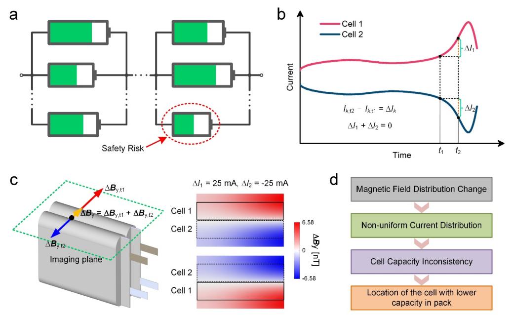 图3基于磁场成像检测电池组容量一致性。(a)电池组容量不一致问题。(b)电池组内部非平衡电流。(c)磁场测量平面及磁场仿真结果。(d)检测方法原理图。