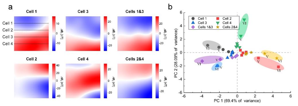 图4使用磁场图检测电池组容量一致性。(a)电池组磁场图。(b)主成分分析结果。