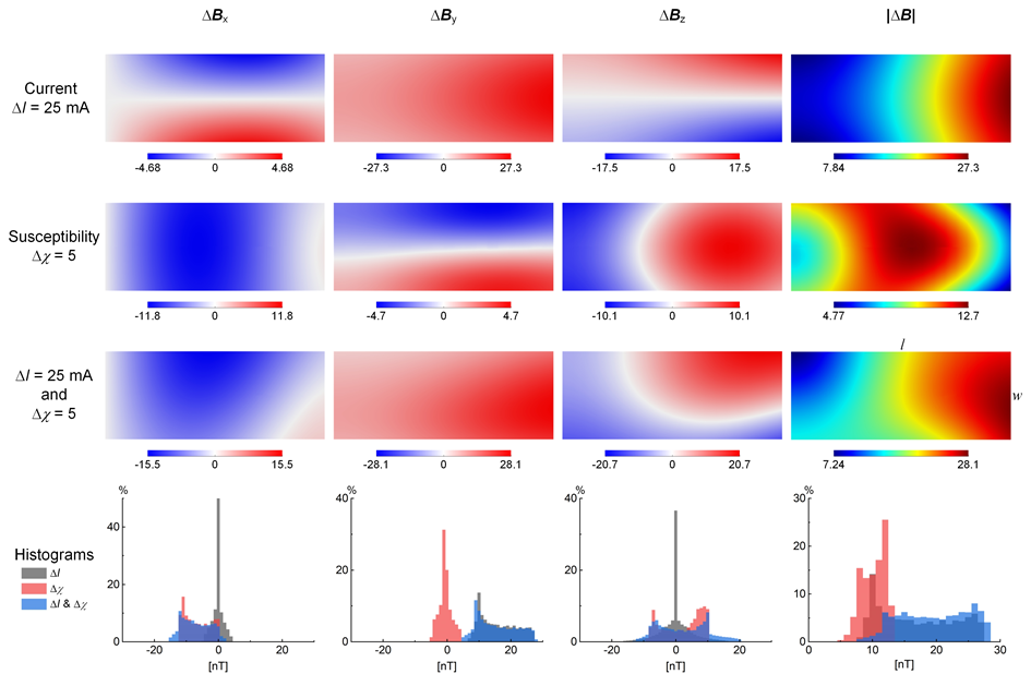 图2电池电流和电极材料磁化率对感应磁场的影响
