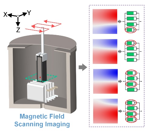 基于磁场扫描成像的动力电池组容量一致性原位检测技术原理如图3所示。在复杂运行工况下,电池组中电芯容量一致性逐渐变差(图3a)。电芯容量不一致会在充放电过程中导致电池组内产生非平衡电流(图3b)。这种非平衡电流会产生过多热量,加速电芯性能老化、加剧电池组容量不一致,以及带来潜在的热失控等安全风险。非平衡电流将导致电池组外部感应磁场变化(图3c),通过检测电池组外部感应磁场变化,就可以反演电池组内部非平衡电流变化,进而可以评估电池组容量一致性。此外,可以根据磁场变化特征准确定位故障电池位置(图3d)。