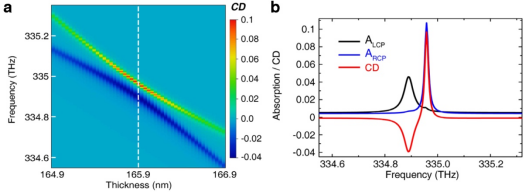 图2. (a)不同厚度超表面的CD光谱。(b)超表面厚度t=165.9 nm时的圆偏振光吸收谱和CD谱。