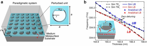 针对这一条件,作者设计了一个全介质超表面(图1a),由介质板(n=2.4)上二维周期性的圆孔阵列构成。由于结构的C2对称被扰动Δ打破,在布里渊区的中心(Γ点)会产生一系列具有高Q值的连续域中准束缚态(准BIC)。进一步,作者选取了TE4和TM1这一对远离其它模式且近似满足电磁对偶性的准BIC态,并通过调节介质板的厚度使二者在Γ点处发生简并。由于这两个模式是正交的,当无外源手性引入时,二者不发生耦合,而当κ=(2+0.4i)×10−4的手性溶液引入该系统时,会诱导两个准BIC态的耦合,产生强拉比劈裂(Rabi splitting)并形成两个新的混杂模式,即上支UB和下支LB(图1b)。根据计算,产生的拉比劈裂值大于两个模式线宽,因而严格满足强耦合条件。