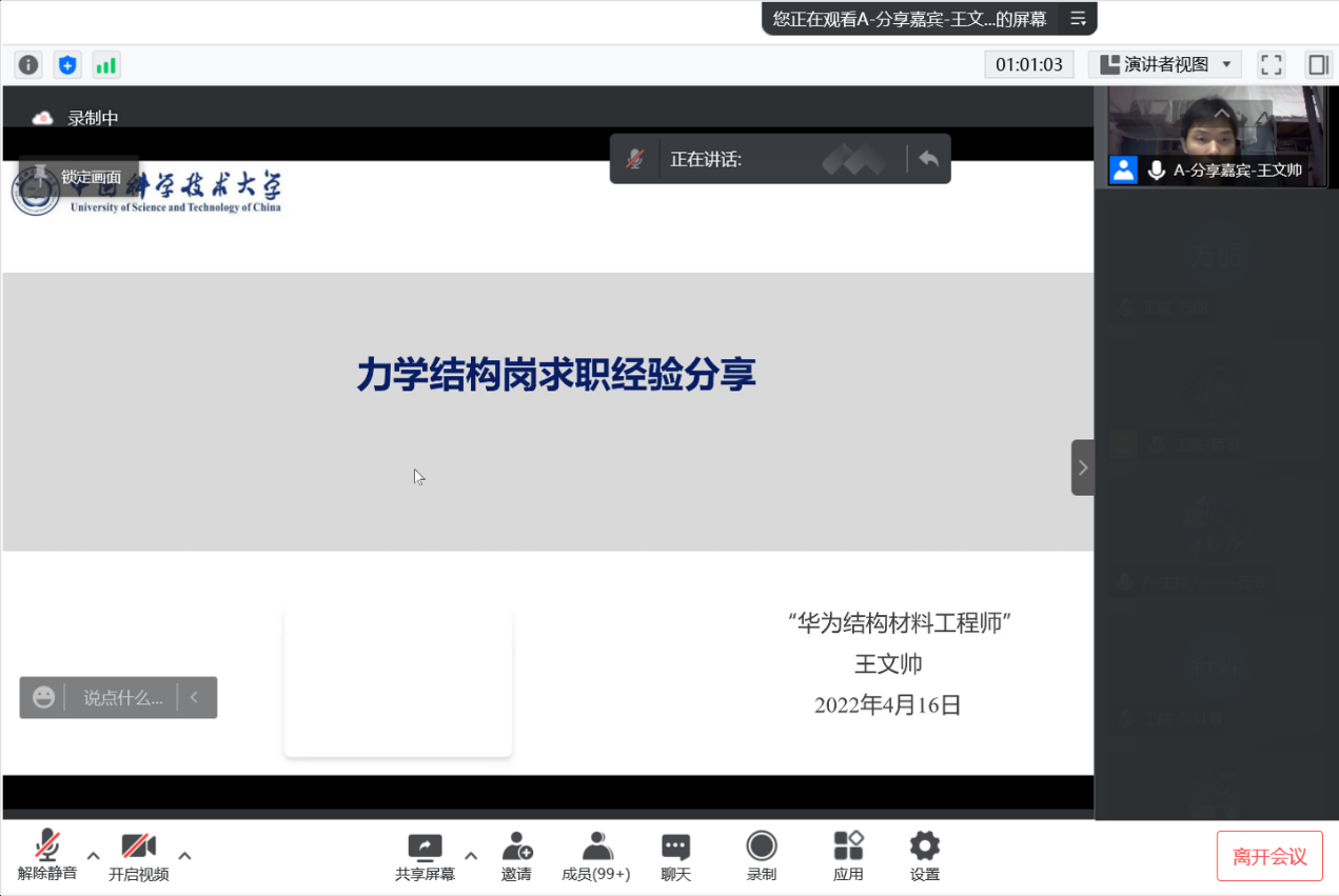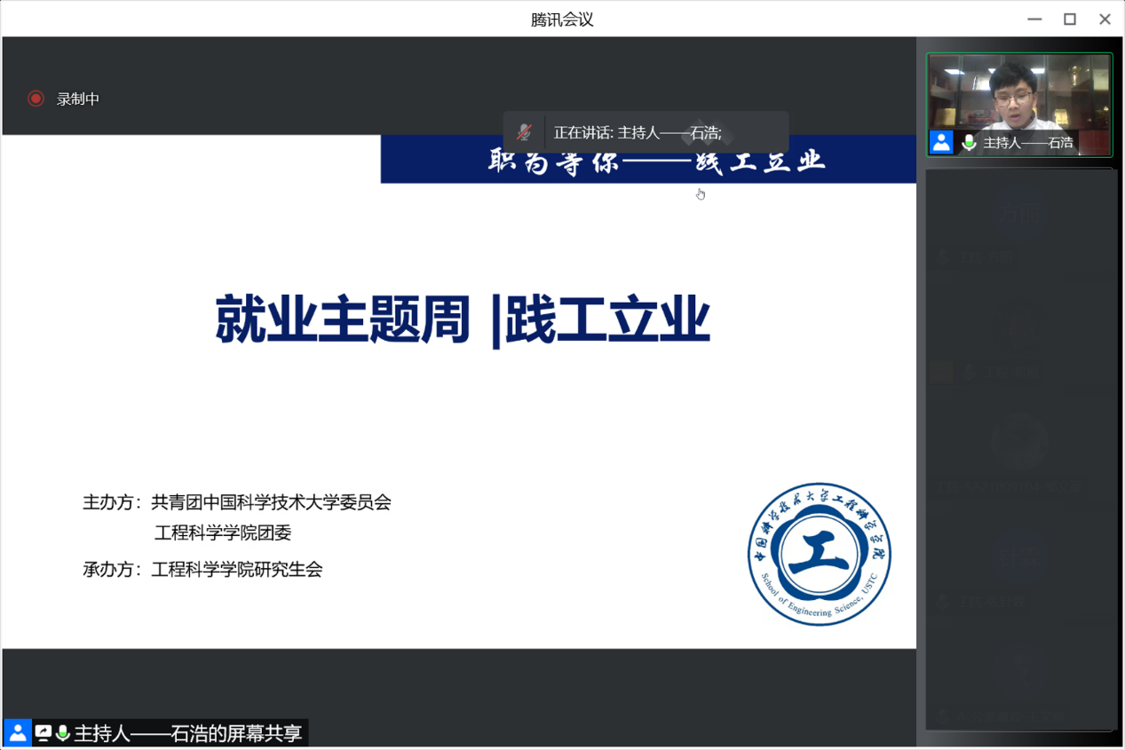 4月16日晚19:00,工院就业经验分享会之企业篇通过腾讯会议线上召开。本场分享会邀请了2019级精密机械与精密仪器系硕士研究生伍尹洁、2019级近代力学系硕士研究生王文帅、2016级精密机械与精密仪器系博士毕业生徐嘉骏、2018级热科学和能源工程系硕士毕业生朱秀根四位嘉宾进行经验分享。