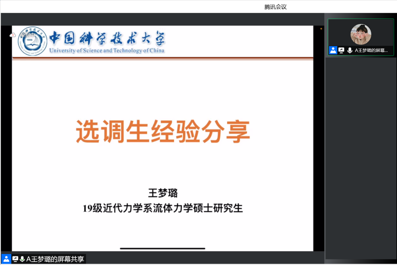 4月17日晚19:00,就业经验分享会之选调篇通过腾讯会议线上召开。本场分享会邀请了2019级近代力学系硕士研究生王梦璐、2018级热科学和能源工程系硕士毕业生冯珊、2018级热科学和能源工程系硕士毕业生李雯、2016级近代力学系博士毕业生王锦四位嘉宾进行经验分享。