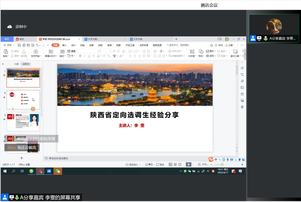 李雯师姐分享了她选择陕西定向选调的原因及初心、工作情况、个人感悟与建议。李师姐提醒大家在备考的时候,大家一定要清晰自己的求职目标,不从众,不跟风,选择适合自己的才是最好的。如果真的选择了选调生这个岗位,就要明确初心、心系群众;担当作为、主动增强本领。