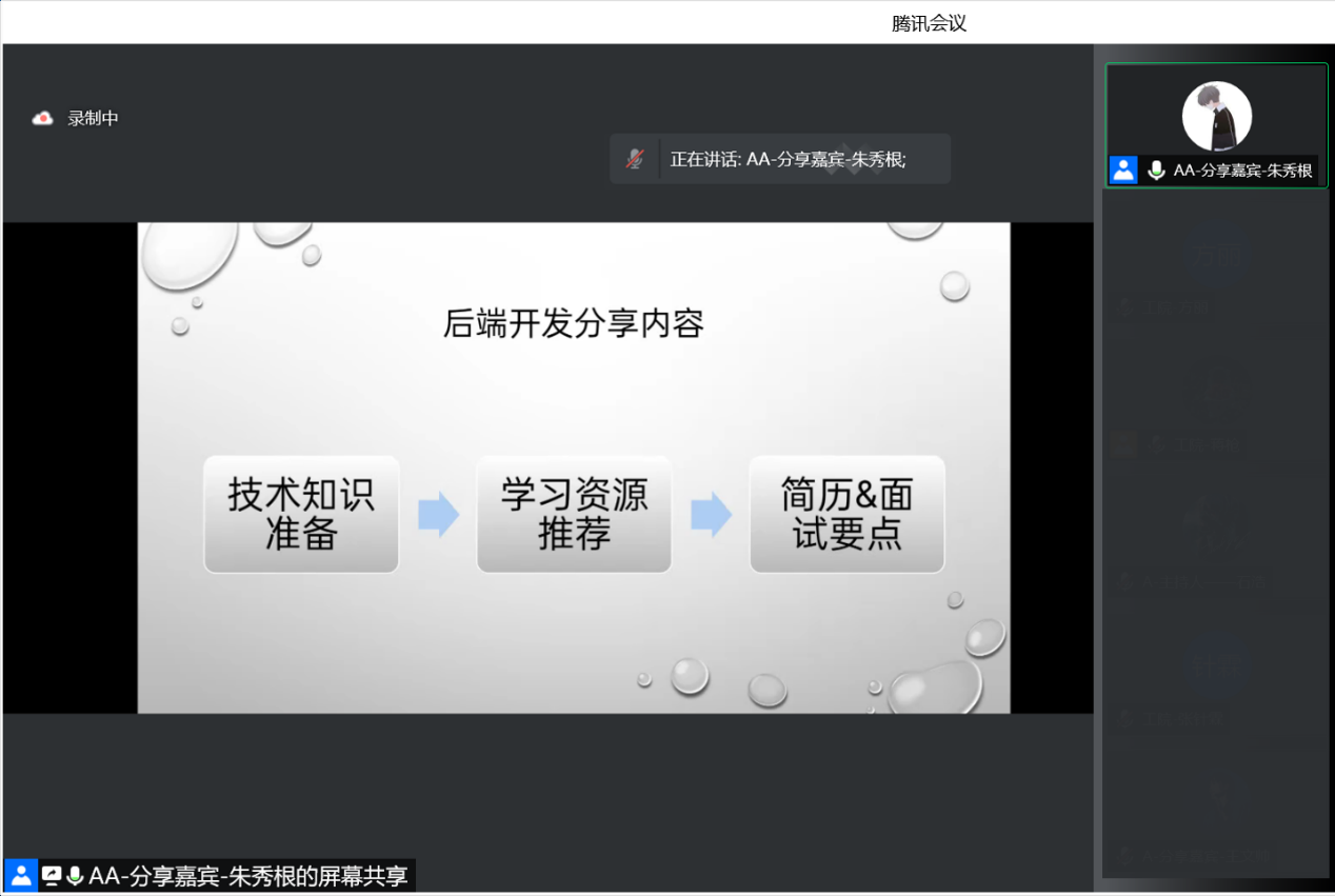 朱秀根师兄分享了后端开发工程师的一些求职的经验。师兄首先分享了学习路线和方法,罗列了后端开发工程师需要学的一些知识、推荐相关的学习书籍以及学习网站。另外,他还分享了一些面试的要点及注意事项。师兄建议当面试官问到不会的问题时,要学会引导面试官提问所能掌握的领域上。