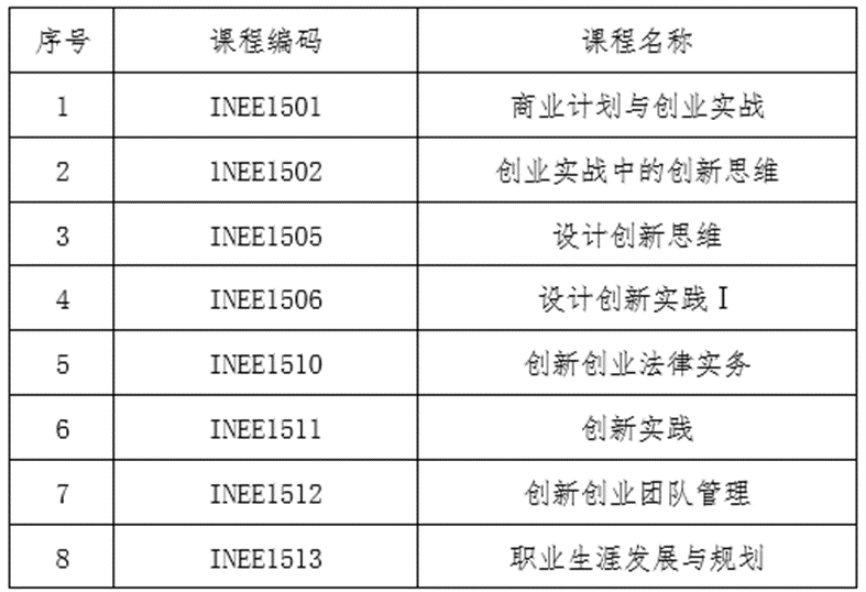 ★特别提示:为保证各位同学加入班级后如期开展相关学习,建议有报名意向的同学尽快在学校研究生信息平台(http://yjs.ustc.edu.cn/)上选修创新创业类课程(课程编号为INEE开头,如下表),以免后期选课系统关闭或选课人数达到上限,无法选课。