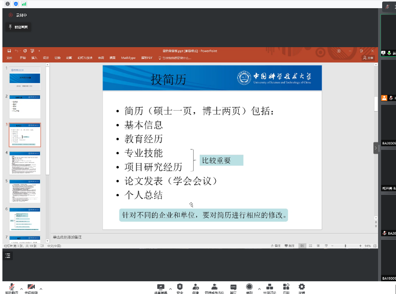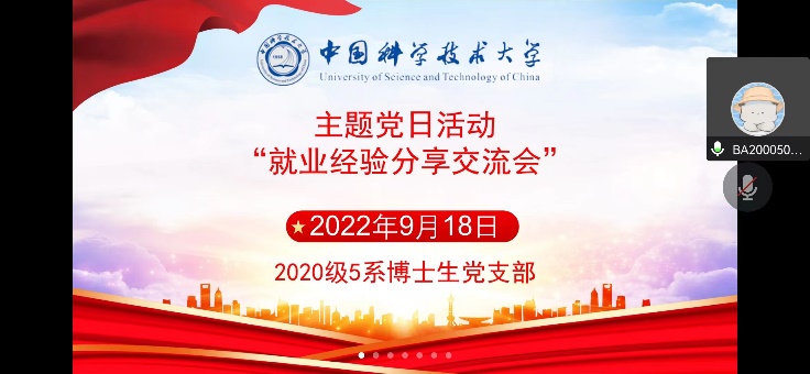 2022年9月18日近代力学系2020级博士生党支部以线上会议的形式举办了本月的党日、团日活动——就业经验分享交流会。活动邀请了工程科学学院党委副书记赵凯老师,近代力学系优秀毕业生姜富航、范希文、张嘉宁三位同学,为大家介绍就业相关信息,分享关于找工作的个人经验与心得体会,帮助同学们更好地了解当前的就业形势,充分做好职业规划和求职准备。