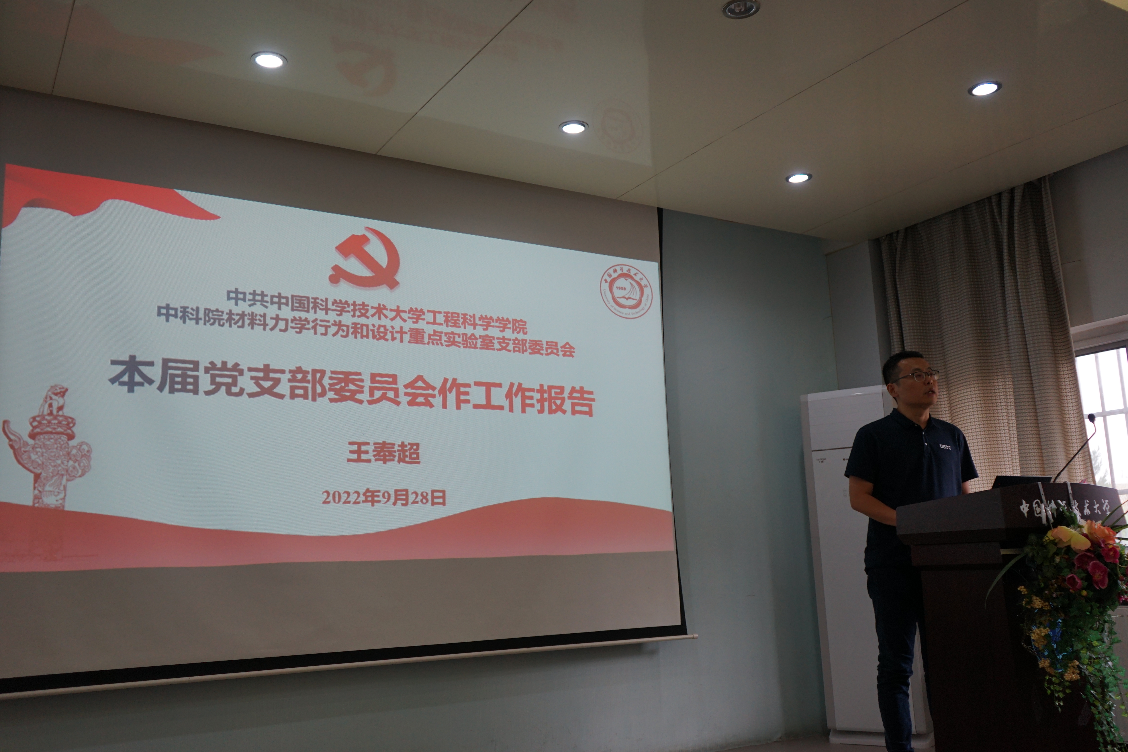 会议在雄壮的《国歌》声中开始。王奉超代表上届党支部委员会作工作报告。他以“传承红色精神,党建引领科研,思政联结师生,践行科教报国”为主题全面回顾了党支部2019-2022三年来的各项工作,,并对下一届党支部委员会的工作开展提出了宝贵建议。